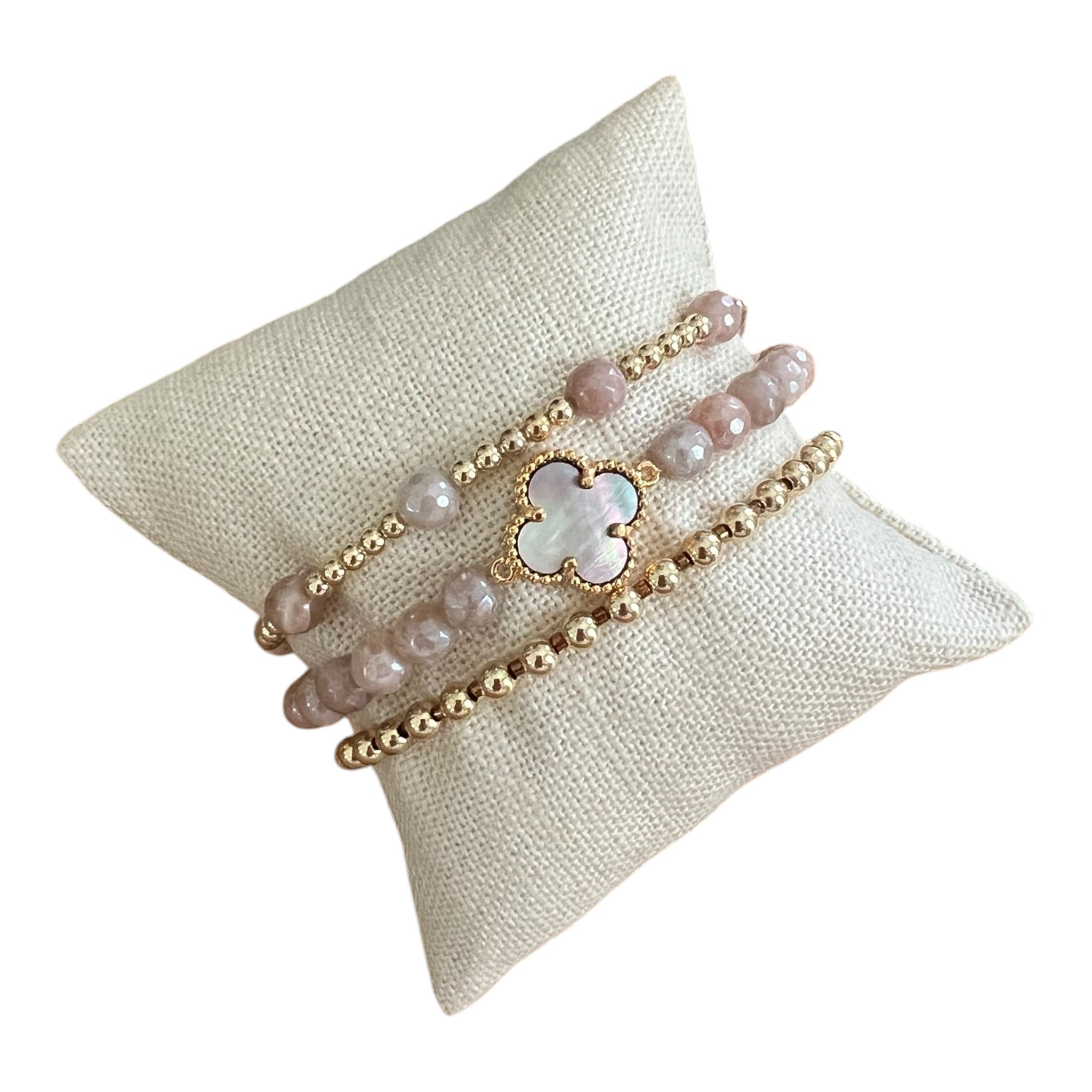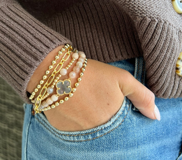All Pansy Day bracelets are strung on a 7 inch elastic band and feature a signature turquoise bead near the clasp.